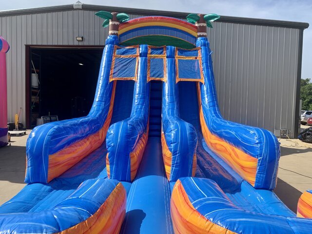 Towering at an impressive **18 feet**, the **Paradise Plunge Water Slide** features two parallel racing lanes, vibrant tropical colors, palm tree accents, and a bold design that instantly transforms any space into an island paradise. Guests climb the secure, easy-to-navigate stairs with sturdy handrails, pause at the top for stunning panoramic views, then launch into an exhilarating race down smooth, high-speed slides. The lanes converge into a spacious, refreshing splash pool at the bottom, delivering safe, cooling fun and plenty of laughter as riders splash and cheer for the winner. Ideal for beating the Alabama heat, this commercial-grade inflatable is built with durable, high-quality materials and thoughtful safety features to ensure smooth, reliable rides for kids, teens, and adults alike.