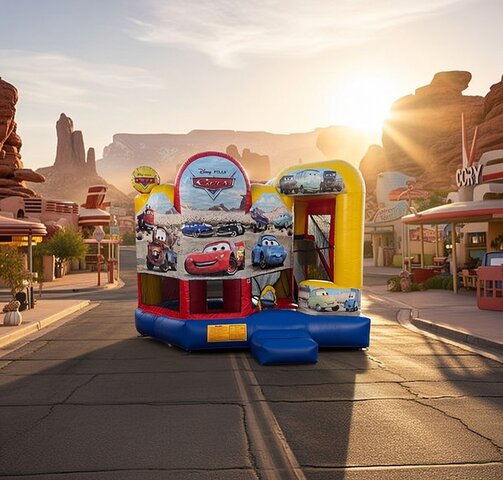 Rev up the excitement with the **Cars Double Lane Water Slide with Bounce House** rental! Lightning McQueen, Mater, Sally, and the whole Radiator Springs crew speed into your party with this high-octane combo. The expansive bounce floor delivers big jumps, the climbing wall adds adventure, the basketball goal keeps things competitive, and twin racing water slides send kids zooming side-by-side into a massive splash pool. Perfect for racing-themed birthdays, summer bashes, school carnivals, and kids' events full of speed, thrills, and cool-down fun.